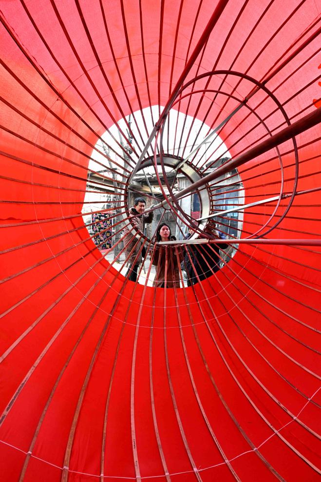 1月15日,工人在石家莊市藁城區屯頭村一家宮燈廠製作大型宮燈。