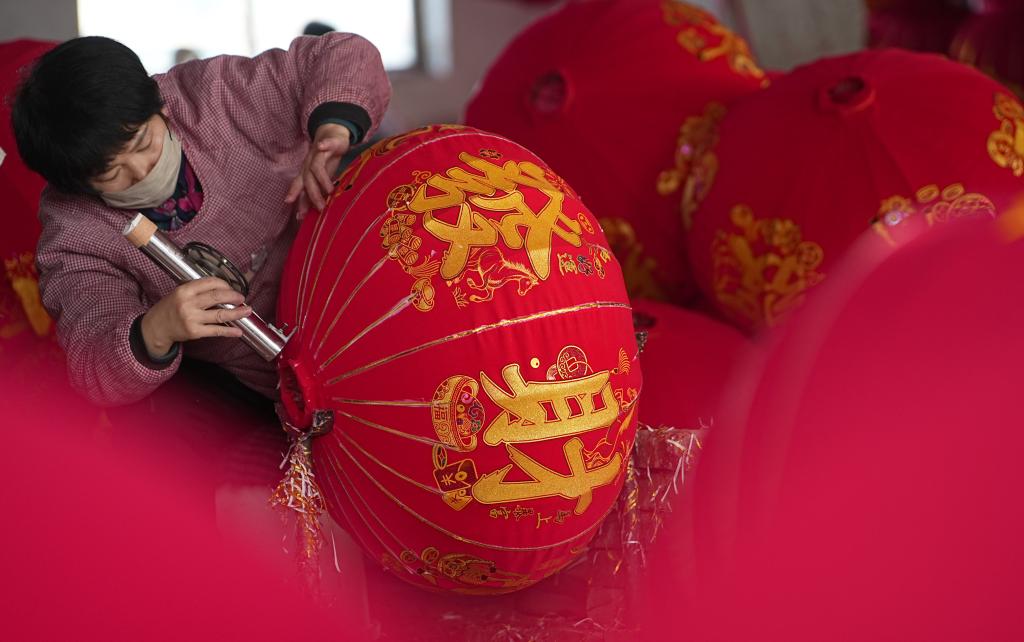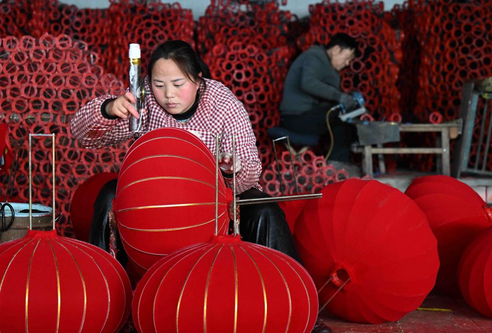 1月15日,工人在石家莊市藁城區屯頭村一家宮燈廠製作宮燈。
