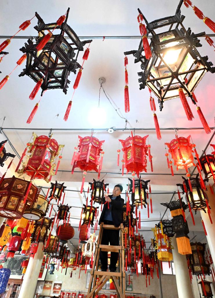1月15日,工人在石家莊市藁城區屯頭村一家宮燈廠展廳懸挂宮燈。