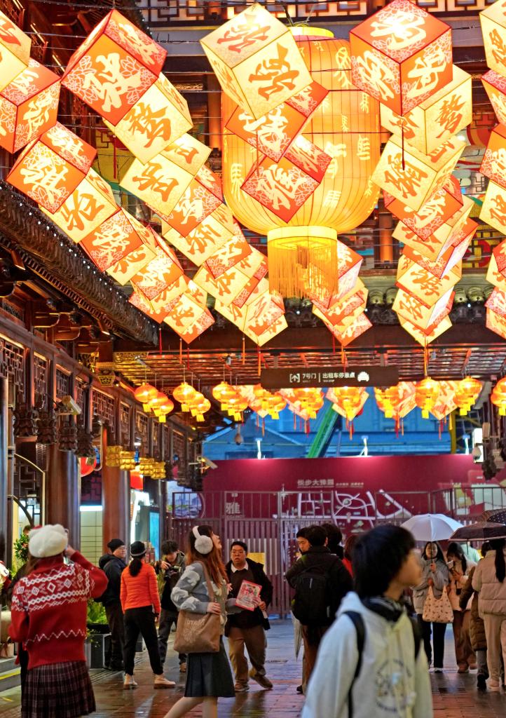 1月26日,豫園燈會上的春聯與流光溢彩的花燈營造出新春的喜慶氛圍。