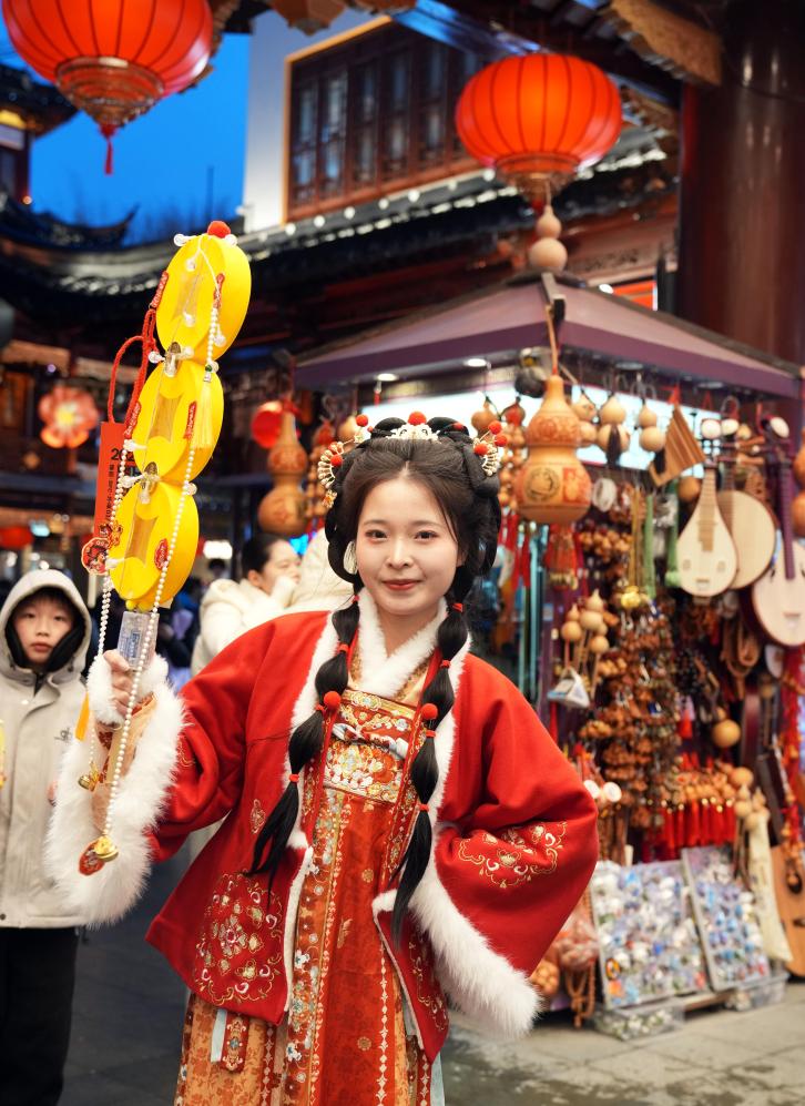 1月26日,一名女士身着傳統服飾逛豫園燈會。