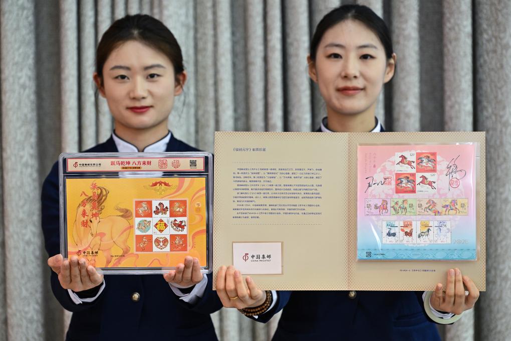 1月29日,工作人員展示活動現場發布的《躍馬乾坤 八方來財》雕刻版生肖主題郵票珍藏擺件(左)和《駿馳元宇》郵票珍藏冊。