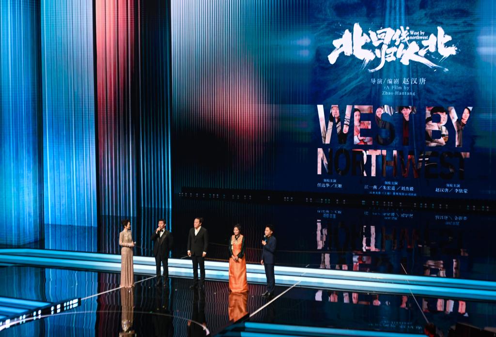 11月11日晚,新片新作《北回歸線以北》主創人員在2025年中國金雞百花電影節開幕式上進行推介。新華社記者 周義 攝