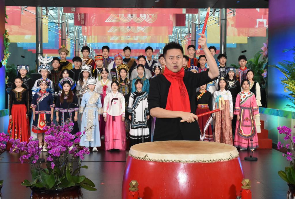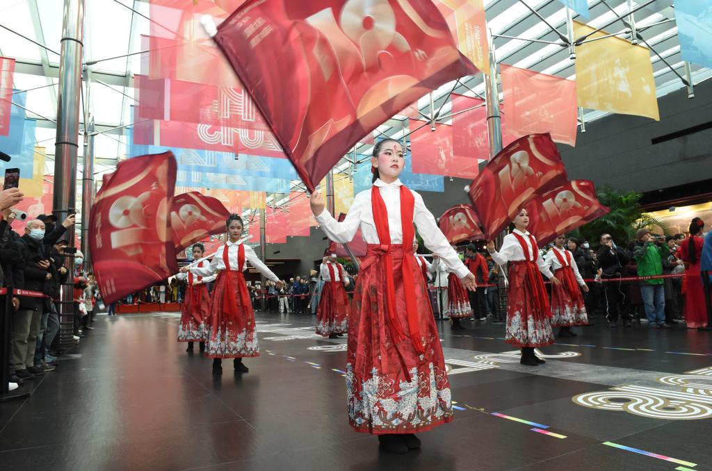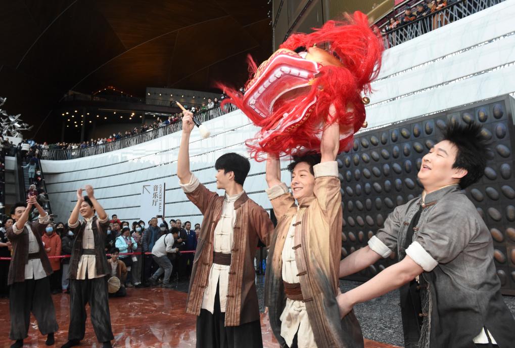 12月22日,演員在國家大劇院北門入口處敲響迎賓鼓,拉開活動序幕。新華社記者 羅曉光 攝