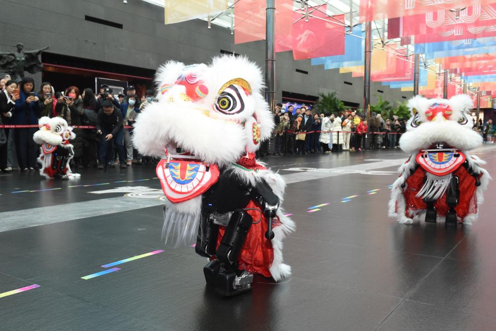 12月22日,機器人在國家大劇院北水下廊道進行“舞獅”表演。新華社記者 羅曉光 攝