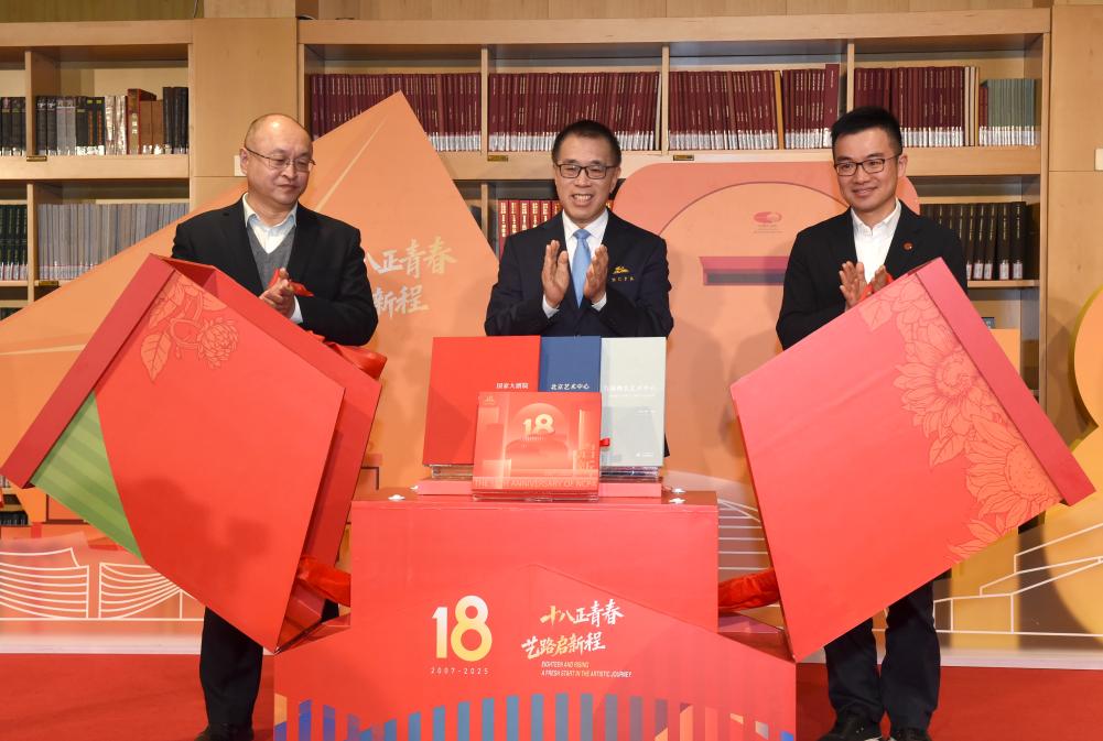 12月22日,國家大劇院院長王寧(中)、北京工藝美術出版社社長夏中南(左)、中信出版集團董事長陳煒共同見證建院18周年“一院三址”系列畫冊和“藝術禮物”系列普及讀物的全新發布。新華社記者 羅曉光 攝