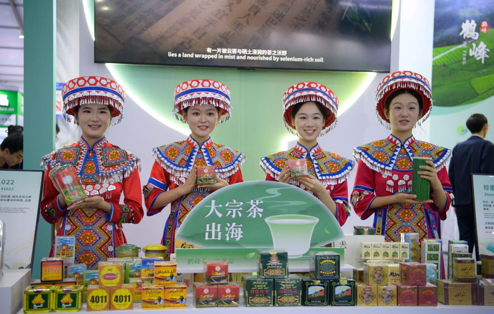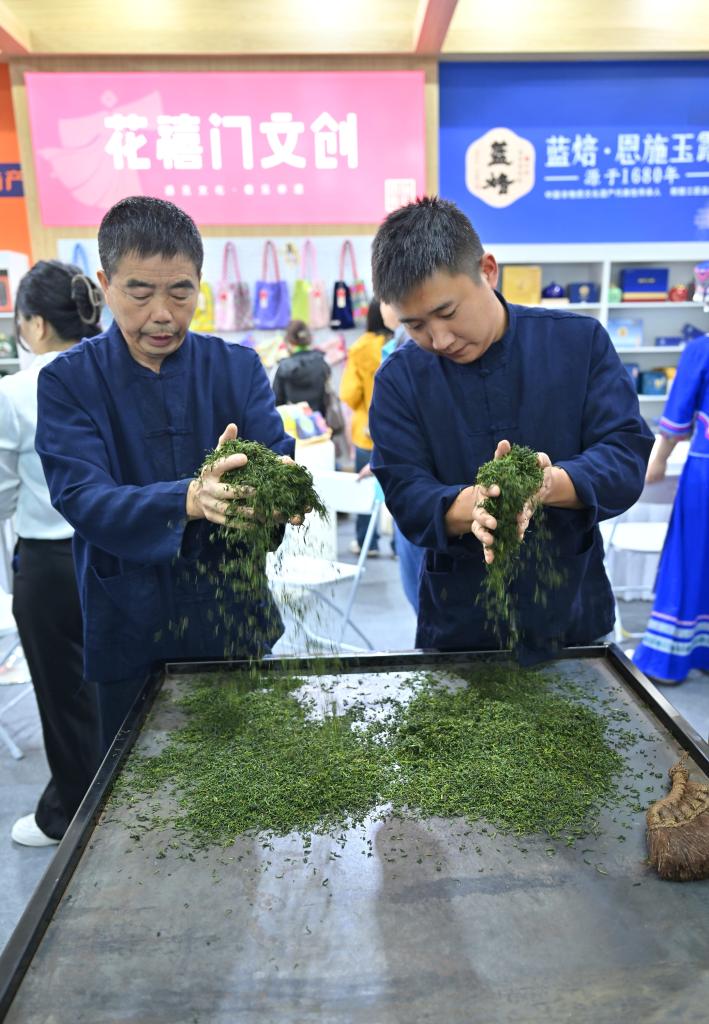 10月18日,工作人員在“硒博會”上展示恩施硒茶的手工製作技藝。