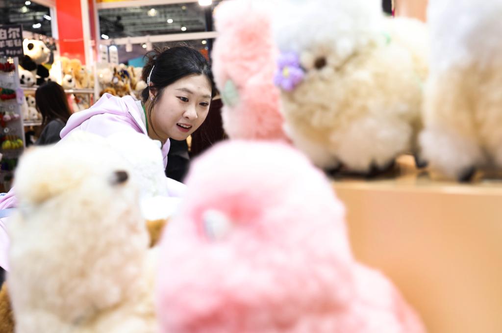 2025年11月8日,在第八屆進博會消費品展區,參觀者在秘魯溫暖駝品牌的羊駝毛製品前駐足觀看。新華社記者 方喆 攝