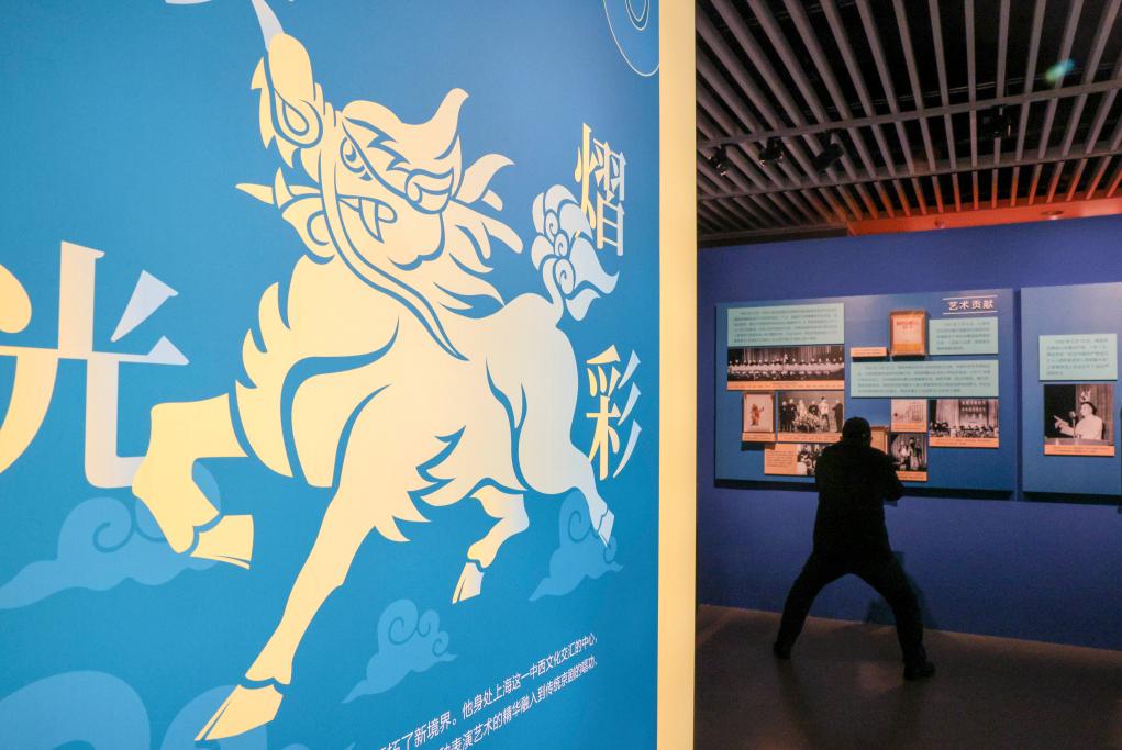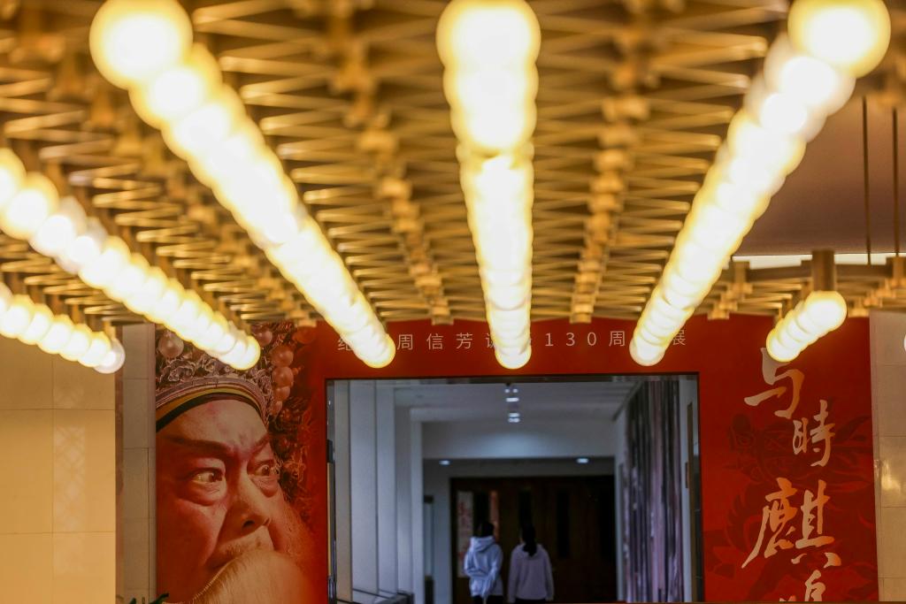 12月12日,參觀者從“與時麒鳴——紀念周信芳誕辰130周年展”展板前走過。