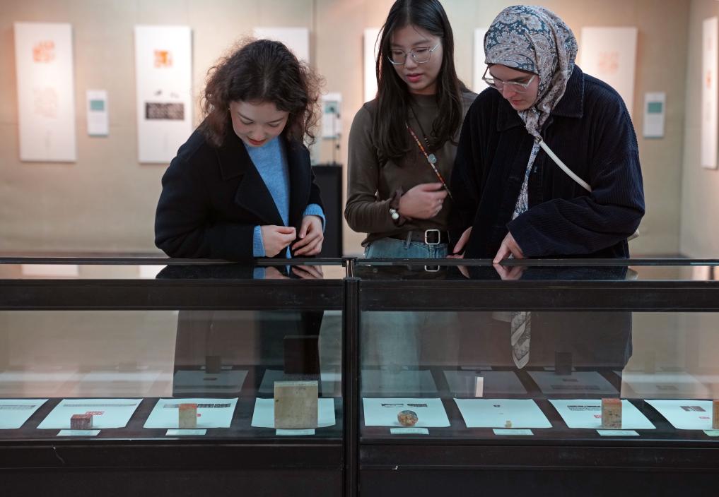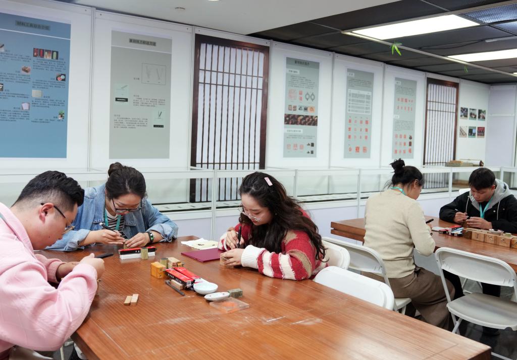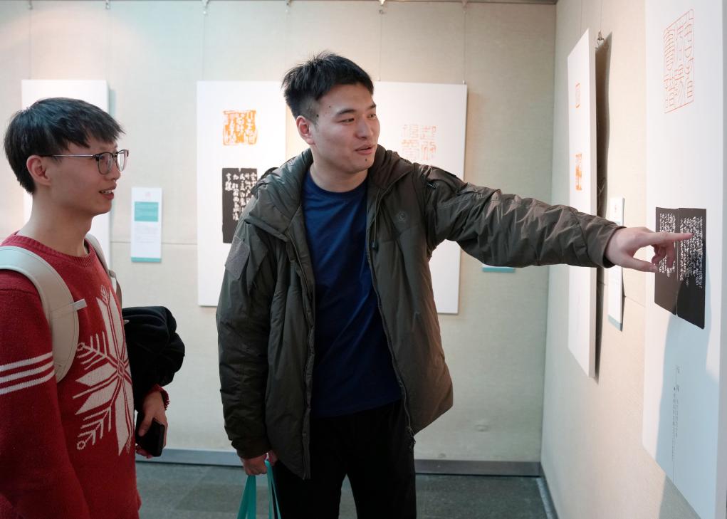 12月19日,在篆刻工作坊,參展學生進行篆刻展示。
