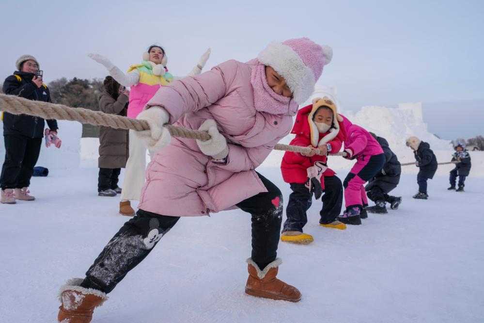 1月8日,小朋友在太陽島雪博會園區玩雪地拔河。