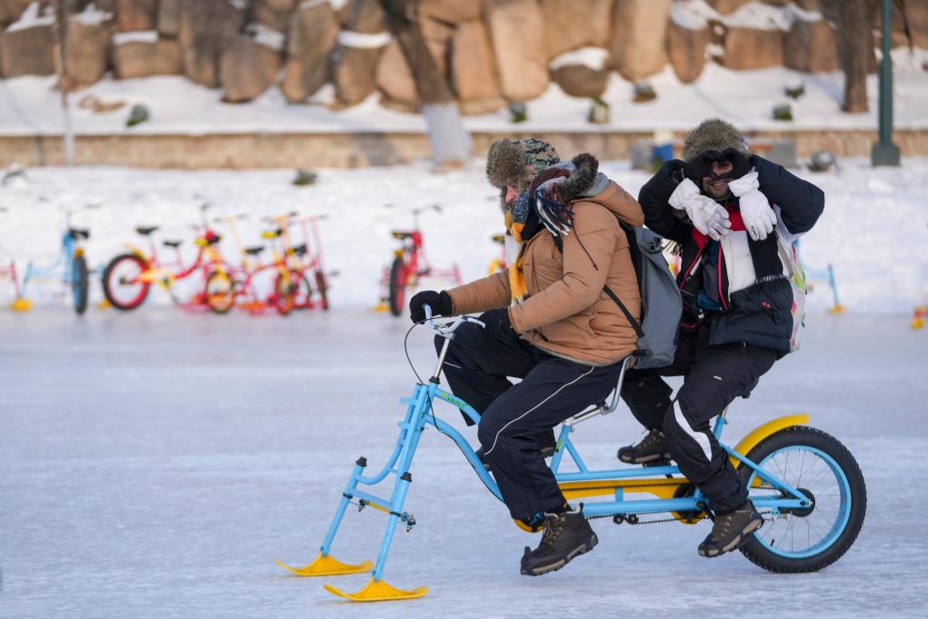 1月8日,外國游客在太陽島雪博會園區體驗冰上自行車。