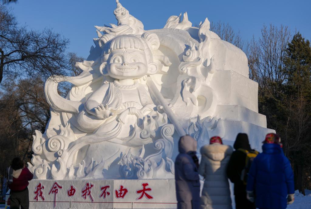 1月7日,游客在太陽島雪博會哪吒雪雕前留影。
