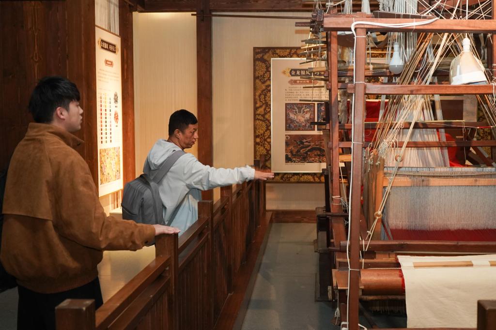 1月16日,游客在江寧織造博物館參觀雲錦織造機。