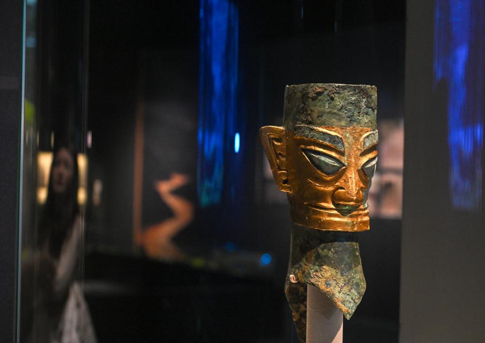 這是展出的戴金面罩青銅人頭像(1月18日攝)。