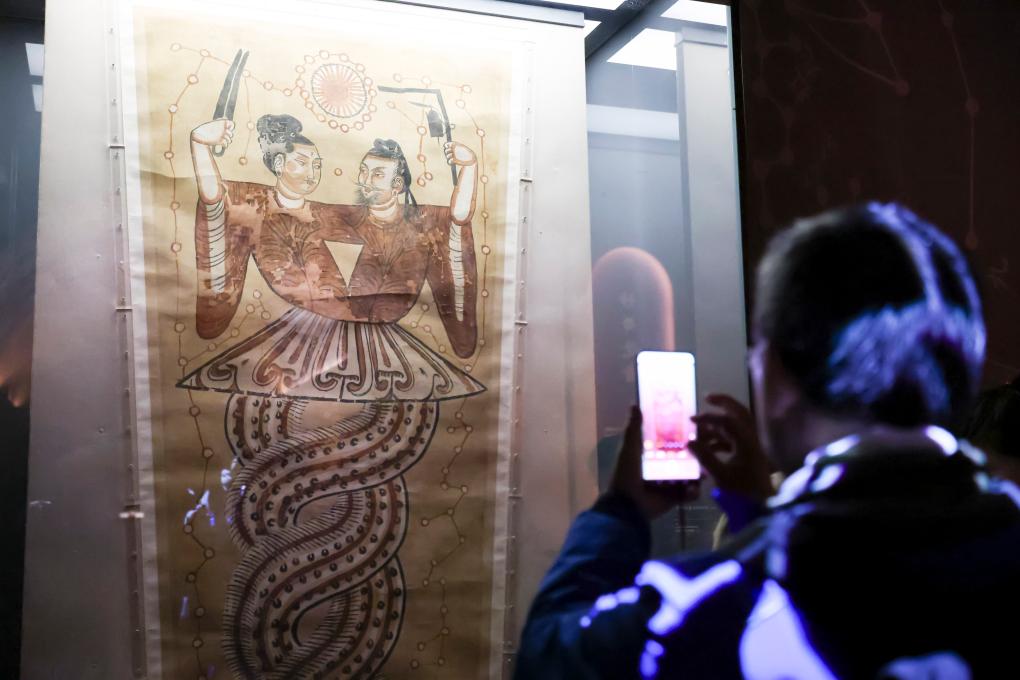 1月20日,觀眾在展覽上拍攝唐代的彩繪伏羲女媧絹畫(胡風)。
