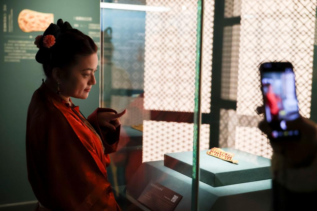 1月20日,觀眾在公元5至6世紀的鑲嵌紅寶石金劍鞘展櫃前拍照留影。