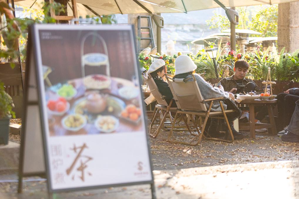 2023年11月25日,在浙江省湖州市吳興區龍泉街道田盛街,游客在一家飲品店圍爐煮茶。 新華社發(伊凡 攝)pagebreak