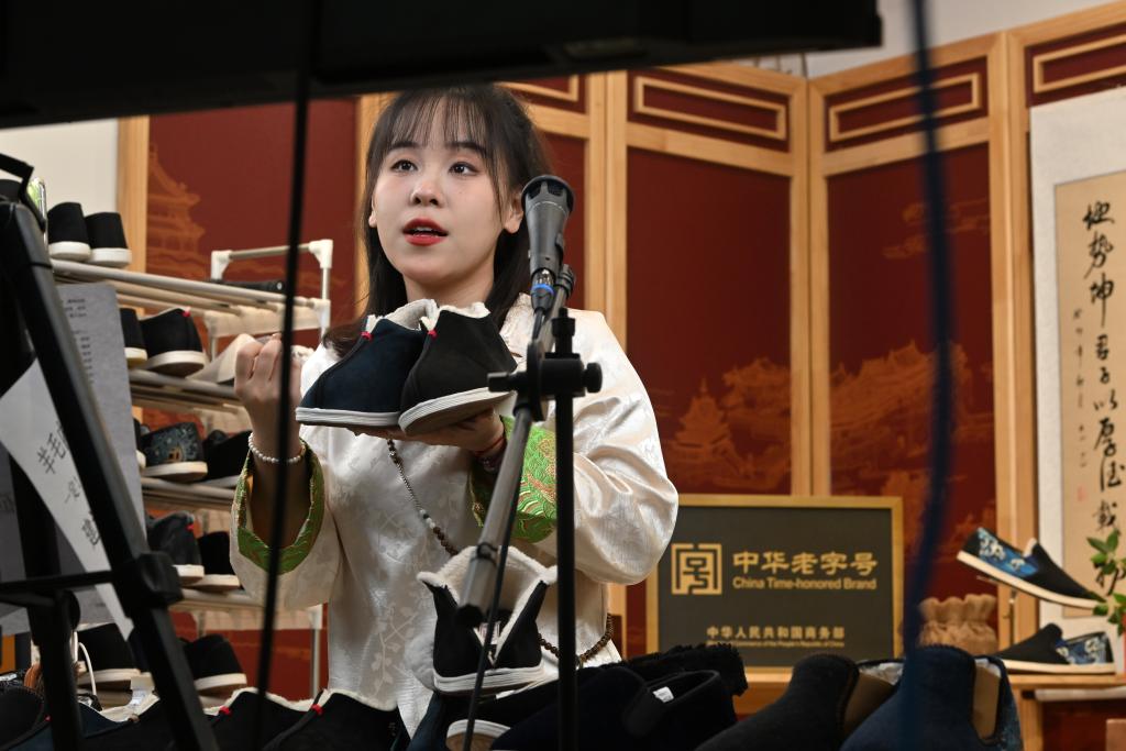 2023年12月8日,主播在老美華的直播基地內帶貨。老美華始創於1911年,歷史上以“千層底”布鞋聞名,是享譽津門的“中華老字號”。新華社記者 李然 攝pagebreak