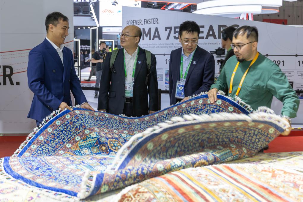 阿富汗客商阿里·法伊茲(左一)在第六屆進博會消費品展區向客商介紹阿富汗地毯。新華社記者王翔 攝