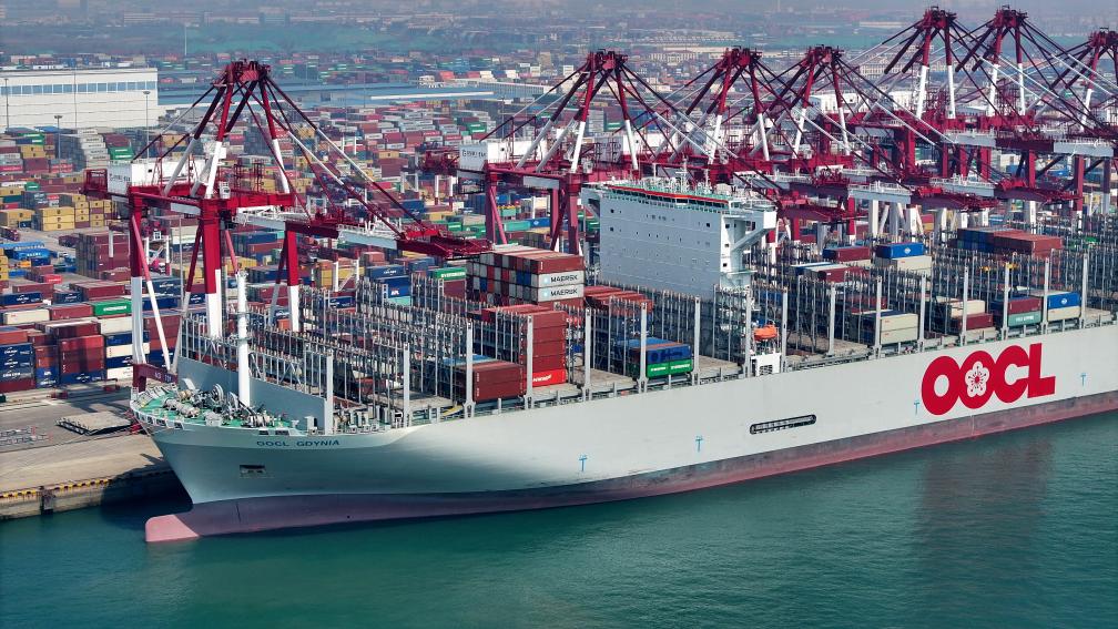 4月10日,一艘集裝箱貨輪在山東港口青島港前灣集裝箱碼頭進行裝卸作業(無人機照片)。新華社記者 李紫恒 攝