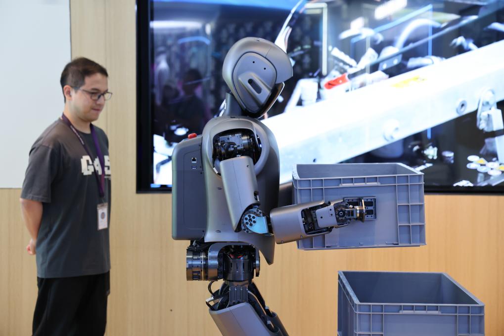4月23日,在深圳優必選科技展廳內,工業人形機器人Walker S演示搬運物品。新華社記者 梁旭 攝