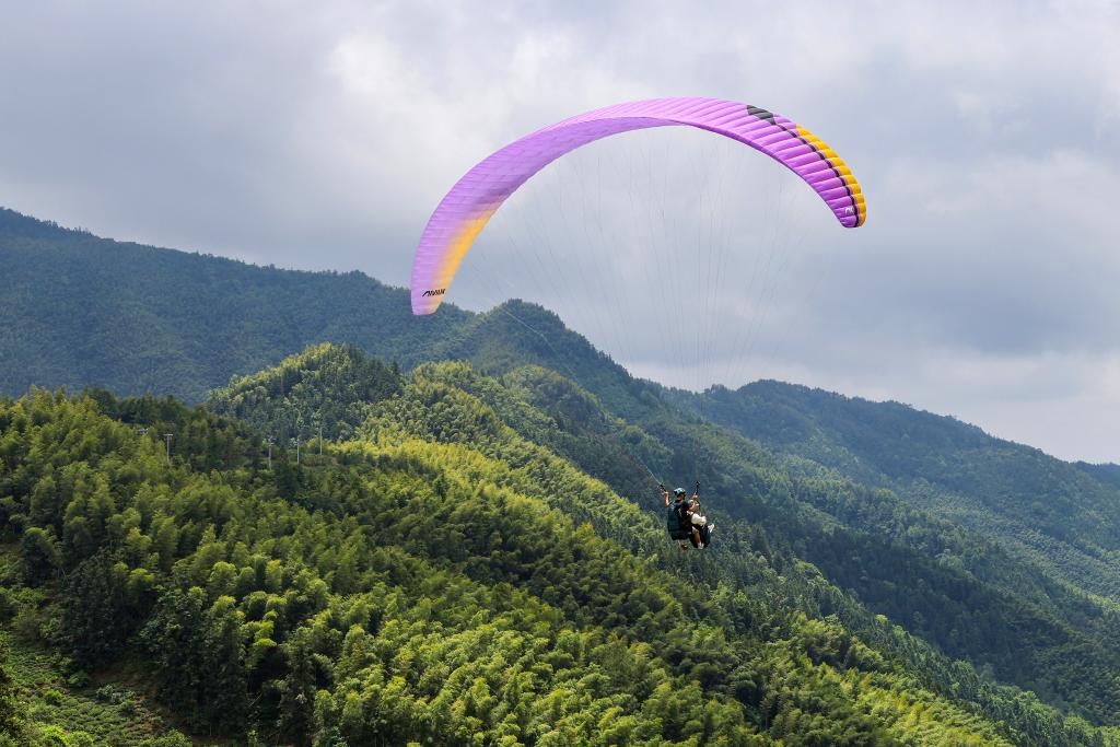 5月17日,在安徽省黃山市黟縣宏村航空飛行營地,游客在體驗滑翔傘。新華社發(樊成柱 攝)