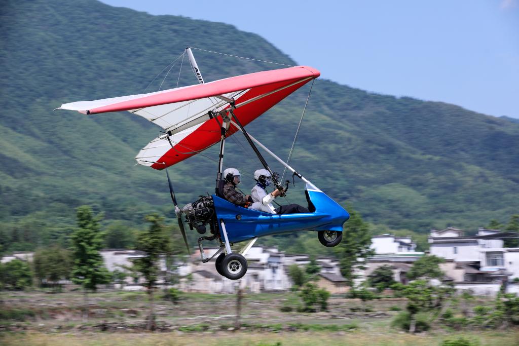 5月17日,在安徽省黃山市黟縣宏村航空飛行營地,游客體驗三角翼飛行。新華社發(樊成柱 攝)