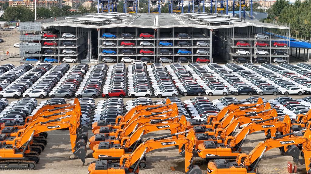 10月20日,國産汽車和工程機械在山東港口煙&港集結等待裝船出口(無人機照片)。新華社發(唐克攝)