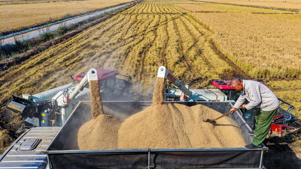 10月27日,河北省唐山市海港經濟開發區王灘鎮農民將收穫的稻穀裝車,準備運出稻田晾曬(無人機照片)。新華社發(劉滿倉 攝)