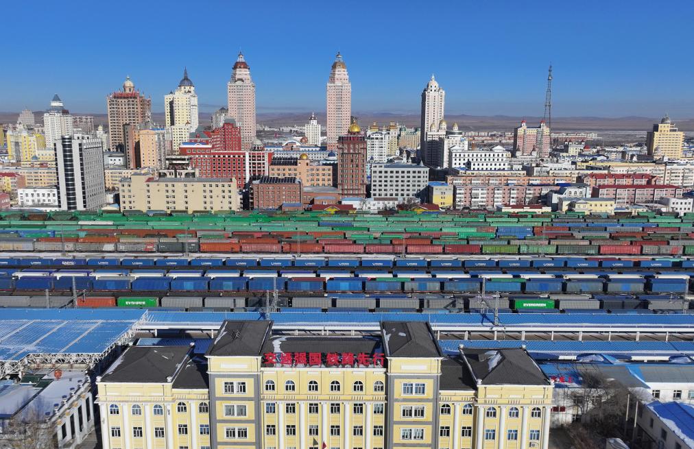 2025年11月27日,中歐班列在中國鐵路哈爾濱局集團有限公司滿洲裏站內整裝待發(無人機照片)。新華社發(黃旭 攝)