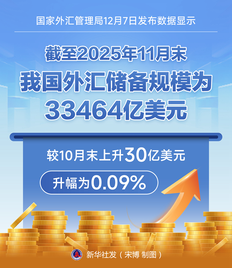 國家外匯管理局12月7日發布數據顯示,截至2025年11月末,我國外匯儲備規模為33464億美元,較10月末上升30億美元,升幅為0.09%。(記者劉開雄)