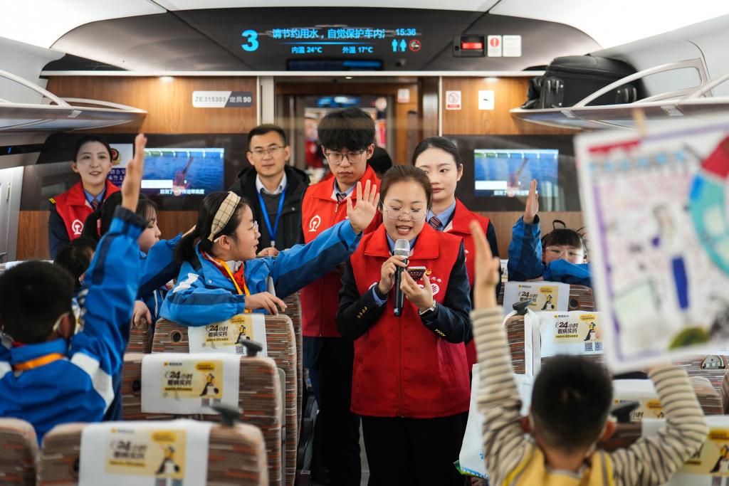 12月7日,中小學師生代表在開往西安北站的復興號動車組列車上參加答題游戲。新華社發(劉翔攝)