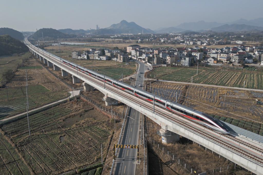 12月26日,首趟始發列車C3132次行駛在杭衢高鐵跨龍麗溫高速公路特大橋上。新華社記者 黃宗治 攝