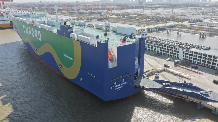 2025年12月9日,在江蘇省蘇州港太倉港區,“港榮”號甲醇雙燃料動力滾裝船在裝載出口汽車(無人機照片)。新華社發(計海新攝)