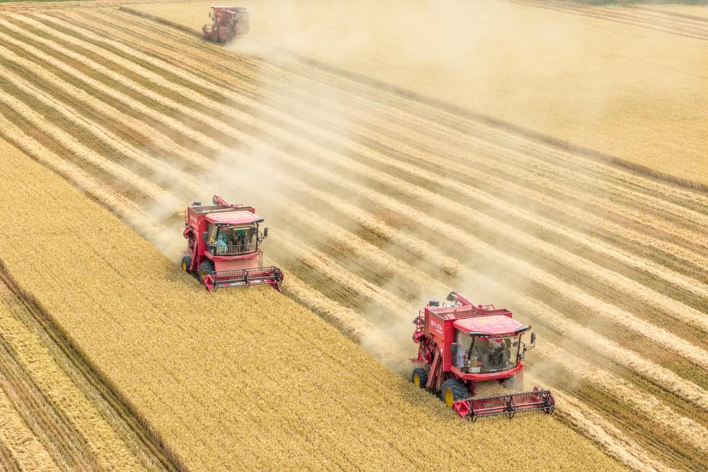 2025年6月9日,河南省三門峽靈寶市西閻鄉東古驛村村民在搶收小麥(無人機照片)。新華社發(杜傑攝)