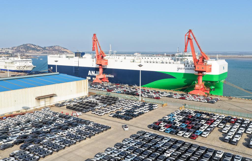 2025年12月17日,在江蘇連雲港港,一艘滾裝船在裝運出口汽車(無人機照片)。新華社發(王健民攝)