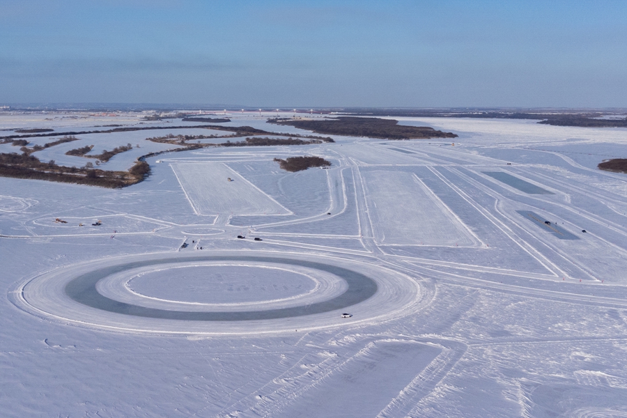 冰面上,十余&作業車輛正緊鑼密鼓地維護專用冰道。隨後,一輛輛測試車相繼駛入,在冰層上疾馳、急剎、甩尾轉向,場面蔚為壯觀。
