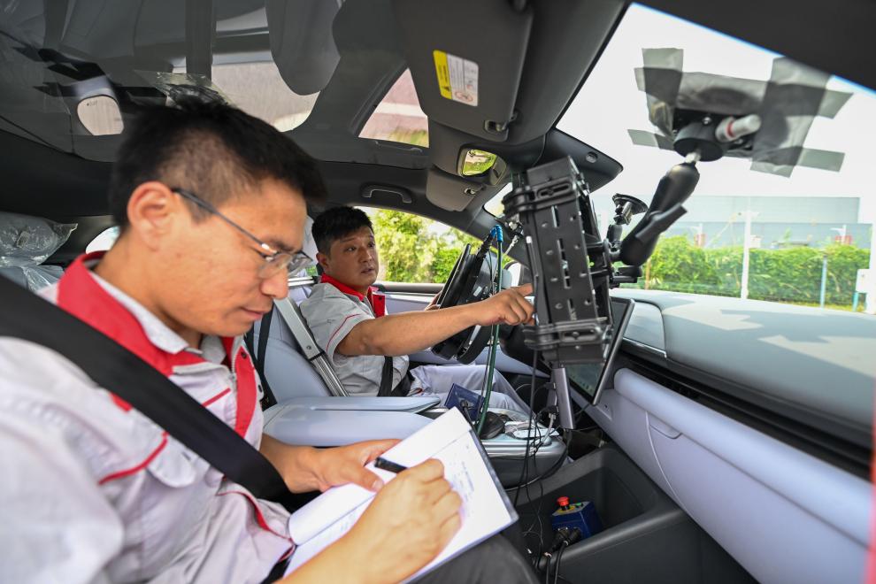 測試員在一輛智能網聯汽車內做測試。新華社記者 孫凡越 攝