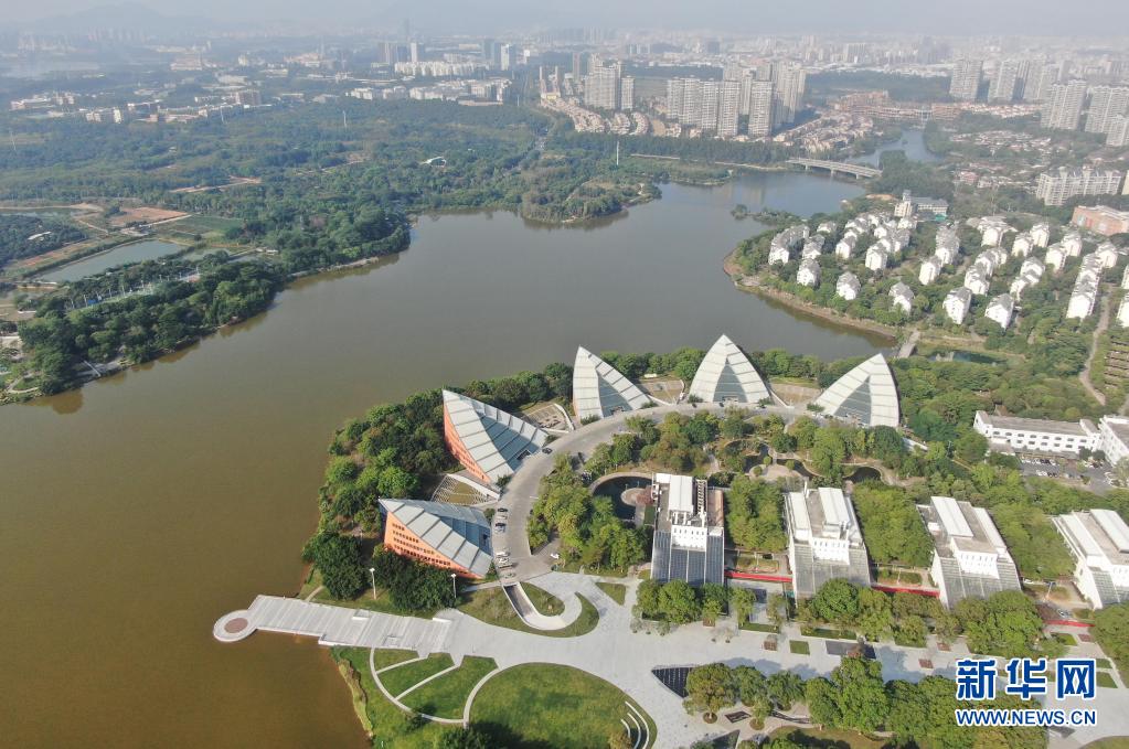 這是2021年4月21日無人機拍攝的東莞松山湖風景。大灣區綜合性國家科學中心先行啟動區(松山湖科學城)2021年4月22日在廣東省東莞市全面啟動。新華社記者 鄧華 攝