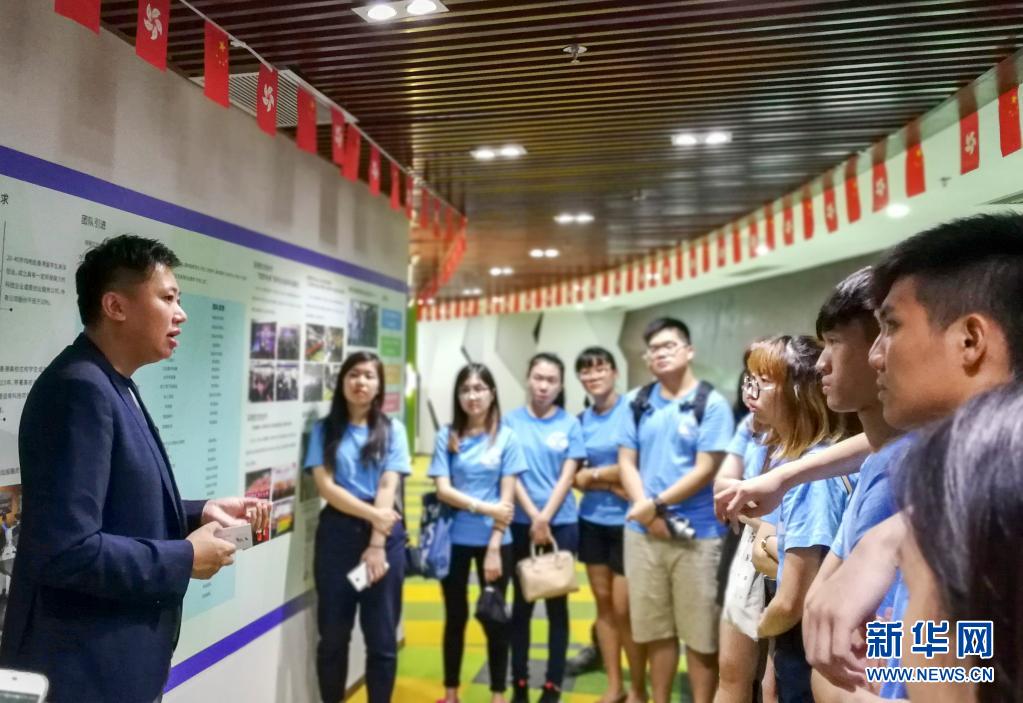 2017年8月,在內地創業的香港青年陳升(左)在深圳南山智園接待香港大學生暑假交流計劃的學員時,介紹基地發展情況。新華社發