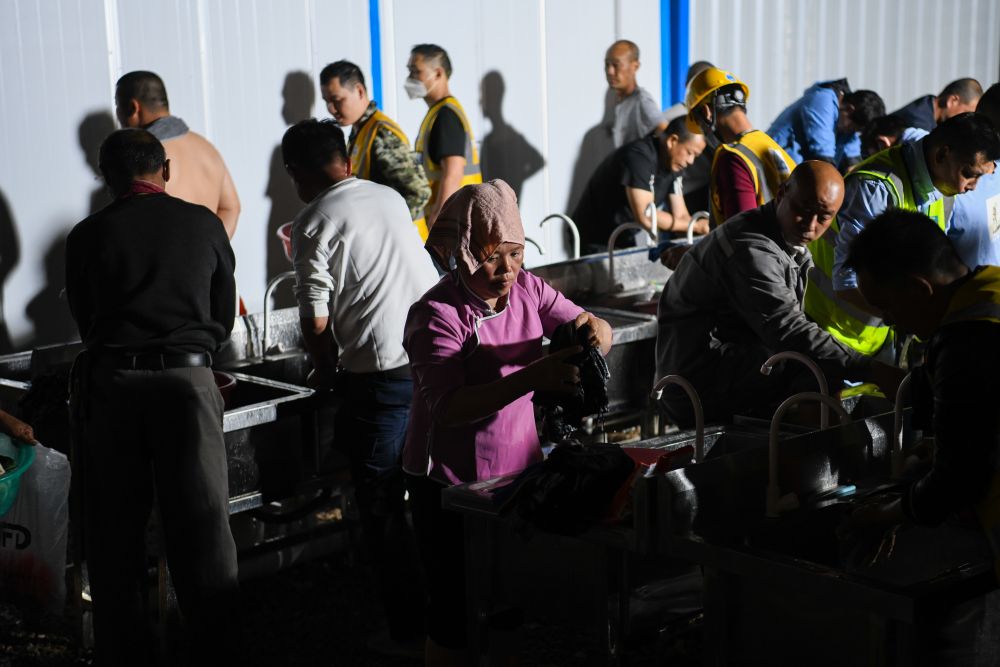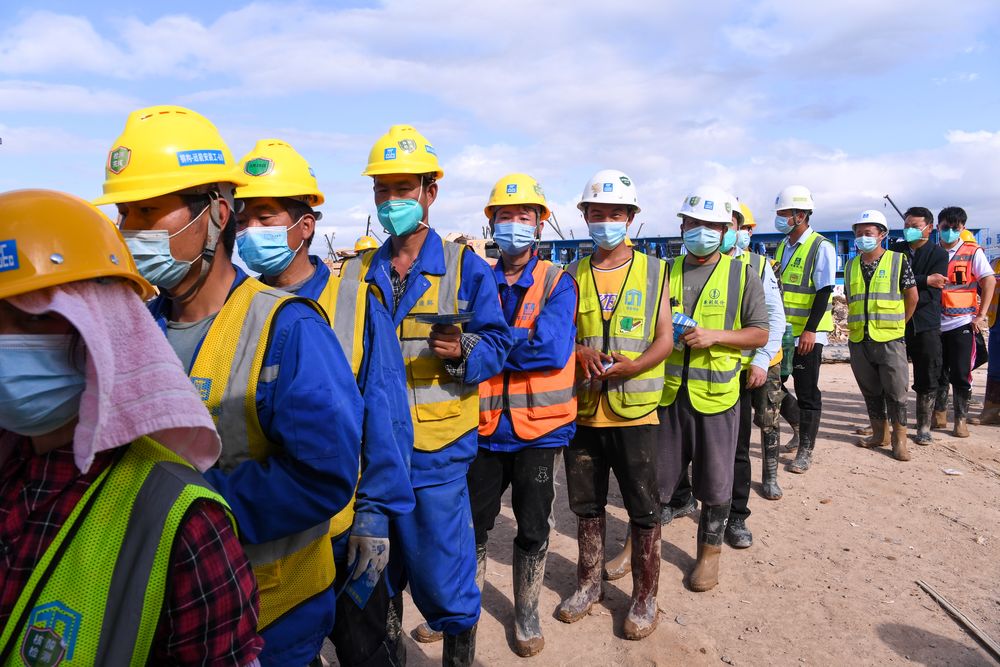 轉而連降暴雨,氣溫急轉直下,雨水和黃土和成泥漿灌進工人生活區的帳篷,行軍床和被褥漂在泥水裏,但為了搶工期,建設者們仍在雨中夜以繼日奮戰。