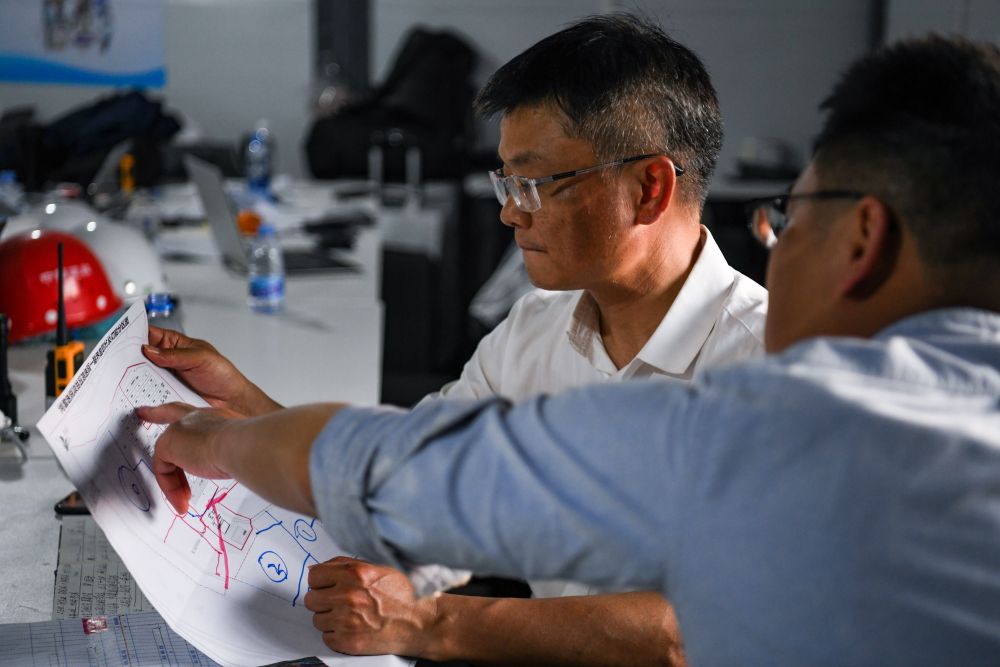 這是中建科工分管生産的副總經理方春生(左),烈日在他臉上曬出口罩的痕跡(3月10日攝)。
