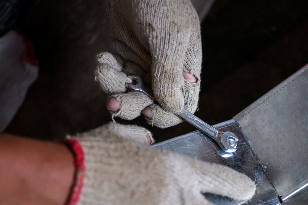 3月27日,工人正在擰緊一顆螺絲,戴着的一雙勞保手套上有多處破洞。