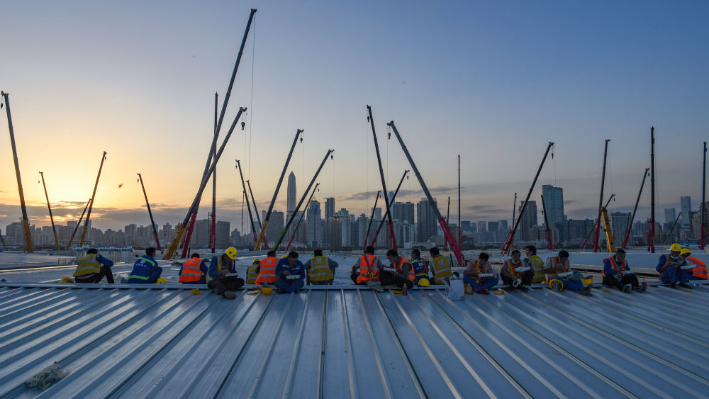 4月8日傍晚,一名工人在應急醫院屋頂施工,他的身後是深圳萬家燈火。