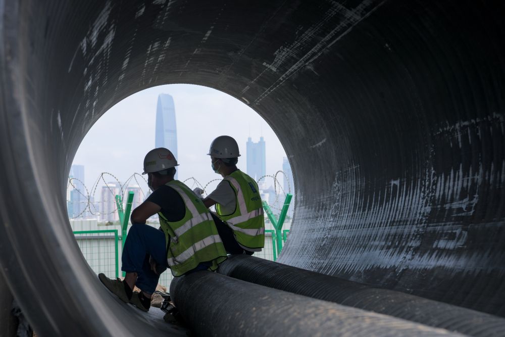 3月21日中午,兩名建設者坐在管道裏短暫午休。