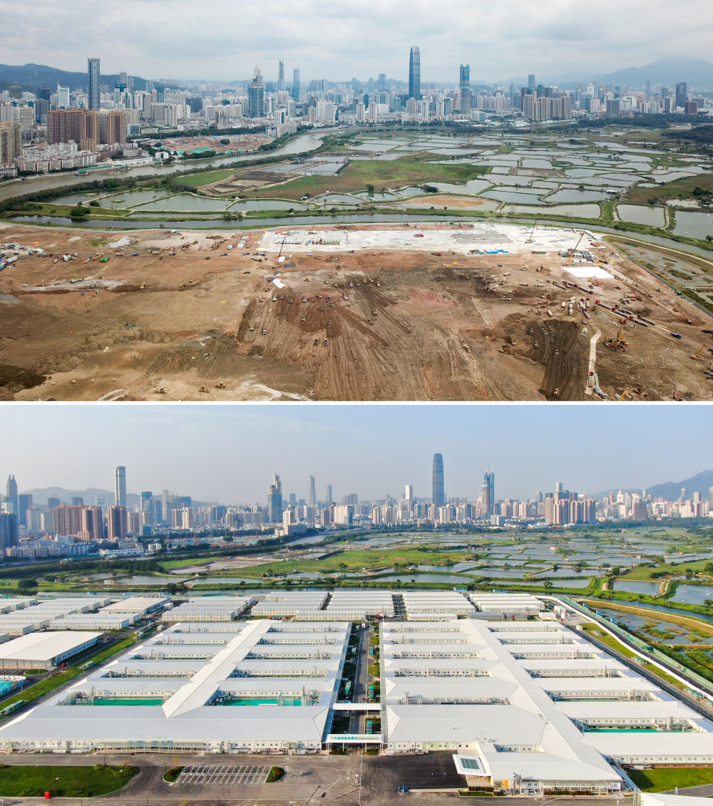 這是中央援港應急醫院建設中、完工後對比照片(上圖拍攝於3月7日,下圖拍攝於5月4日)。