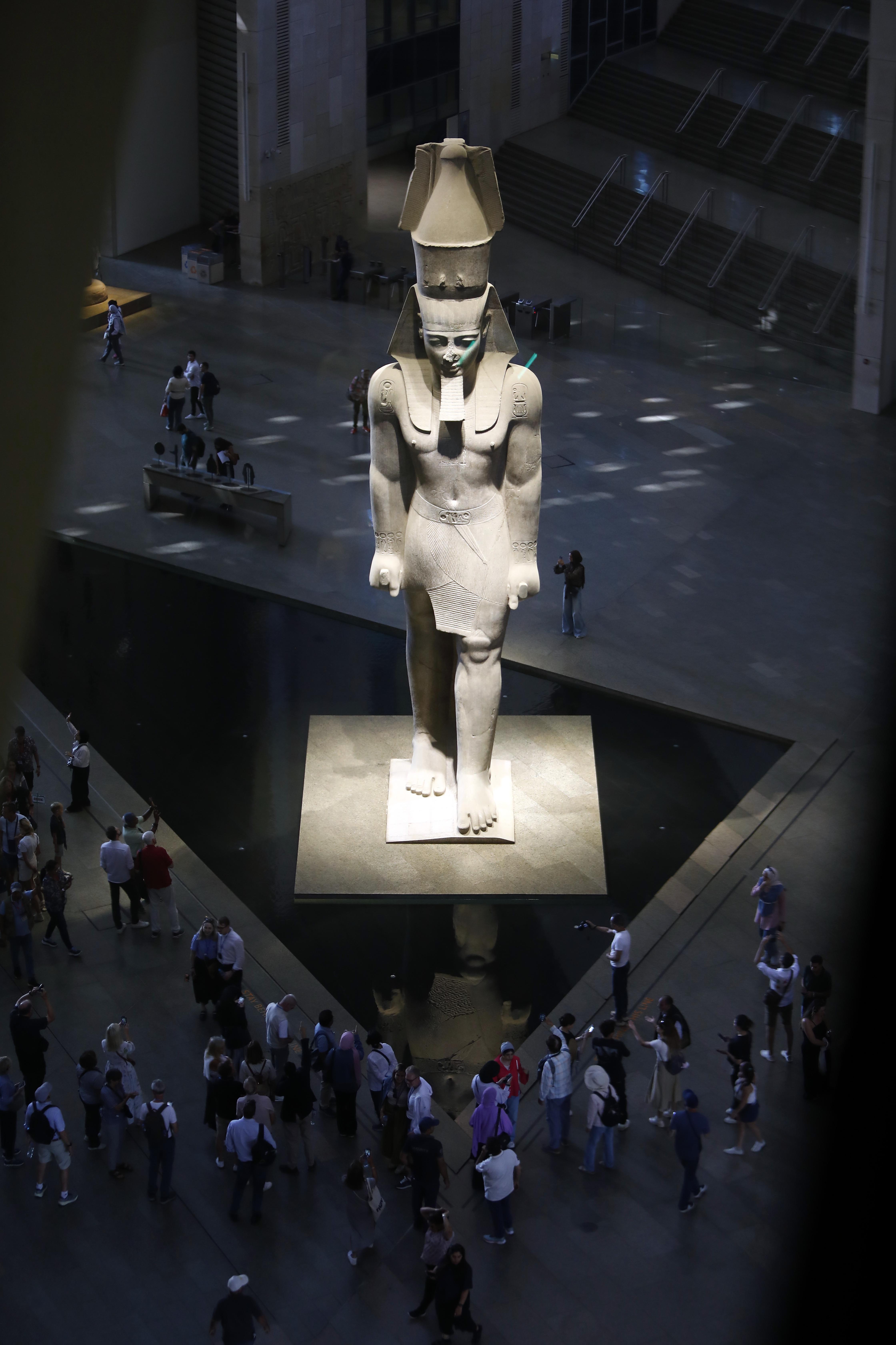 終於,歷經多次復工與調整,博物館建設逐漸收尾。從2022年11月起,館方啟動試運營,向公眾開放外部廣場、中庭大廳、餐飲、商店等區域。拉美西斯二世的巨像首次迎接游客。2023年底,“大樓梯”走廊開放,幾十件不同時期的法老雕像、神像、廟柱等雕刻作品沿階而立,講述古埃及的王權、神明與永恒的故事。