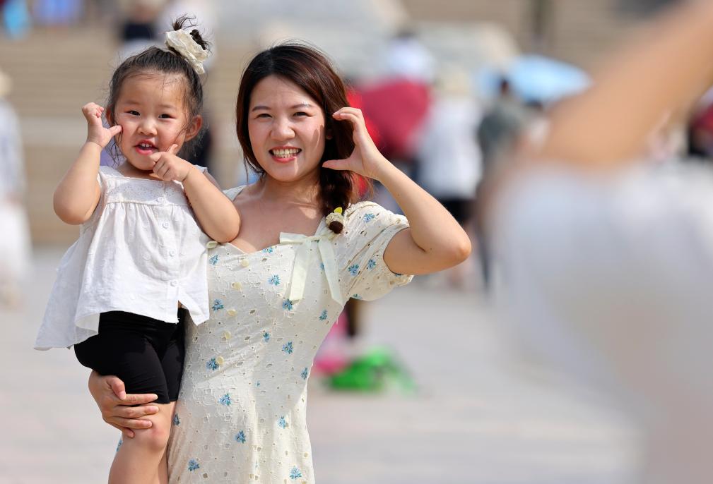 5月3日,家長帶着孩子在海南省三亞市南山文化旅游區游覽。