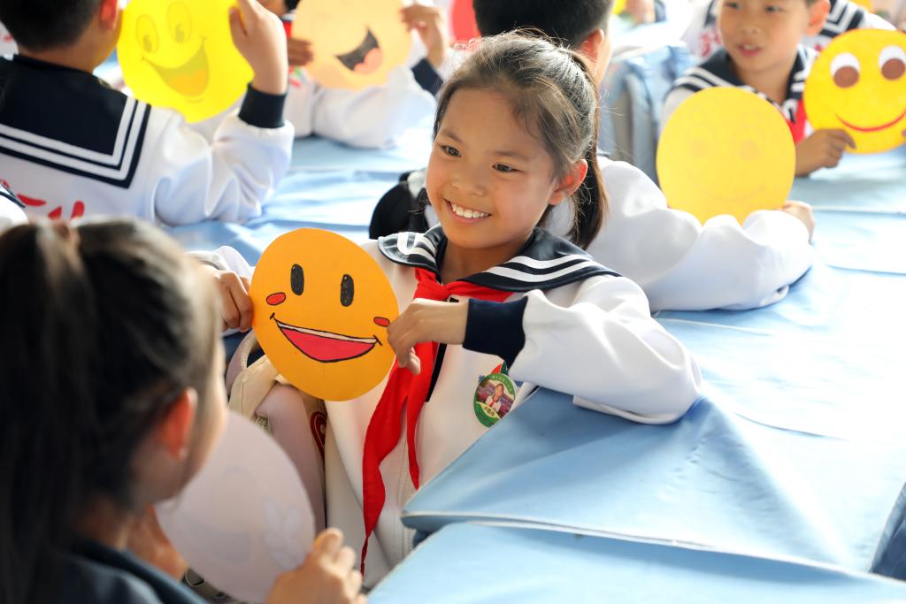 5月7日,山東省濱州市博興縣第一小學的小學生們在做微笑互動游戲。
